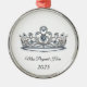 This silver-colored premium metal ornament is shown in a round shape with a sparkling crystal tiara with black text on a white background.