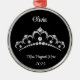 This tree ornament is shown in a round shape with a sparkling pretty faux diamond tiara print, shown with red ribbon and silver rimmed.