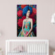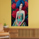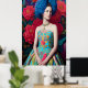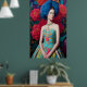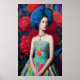 An image of a princess with blue decorative dress and blue afro wig. This is an AI generated artwork with a floral theme.