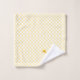 Cute girl's bath towel set done in a princess theme. The bath towel is done in white with a golden yellow crown pattern. The hand towel is white with cartoon graphics of a brunette princess dressed in yellow, with custom name done in an arched brown text. The wash cloth is done in a yellow and white quatrefoil pattern with one large crown. Sweet towel set for any young girl's bathroom.