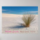The image captures a serene desert landscape with white sand dunes under a clear blue sky. A clump of green desert yucca plant stands prominently in the foreground, casting a long shadow on the rippled sand. The dunes stretch into the distance, creating a sense of vastness and tranquillity. The sky is a bright blue with wisps of white clouds.