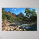 A beautiful landscape image of the Virgin River flowing through Zion National Park. Large rocks, dominate the foreground, sandy brown and rounded from millennium of flowing water. Grasses and green canopied oak trees flank the banks of this fast moving stream. The Watchman, one of the famous mountains in the park, sits in the background, thrusting up into a blue sky that's punctuated with a cluster of spotty white clouds.