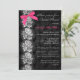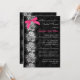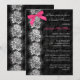 This elegant and sophisticated bridal or wedding shower invitation has a tone on tone black and grey floral pattern background with a silvery white faux textured lace design on it and a hot fuchsia pink PRINTED ON bow that would be perfect for a lingerie shower. The text and paper is all customizable. It is shown here on basic paper. I would NOT use metallic gold, or silver paper as they will both severely darken/alter the colour of the card. ***PLEASE NOTE that if you change the font or size of the font, it may alter how your invitation prints. It will print the way you see it on your monitor, so if you have alignment issues, or sizing problems, please contact me for help before you order. I will not see your invitation once you order it, and Zazzle will NOT edit anything (typos, alignment, etc.). If you require assistance or would like any other matching items, please email your request to niteowlstudio@gmail.com.