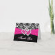 This black and white damask pattern wedding thankyou note card with a PRINTED hot pink ribbon and a pair of faux glitter and jewels joined hearts brooch on it matches the wedding invitation shown below. The text is customizable. Everything will print as you see it on your monitor. I will not see your card, and Zazzle will NOT correct anything (typos, mis-alignment etc.). If you require any other matching items, please email your request to niteowlstudio@gmail.com.