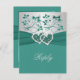 This elegant and romantic silver grey and teal floral wedding R.S.V.P. card has a PRINTED ribbon and a pair of PRINTED diamond jewels and FAUX (simulated) glitter joined hearts brooch on it that matches the wedding invitation shown below. The text and type of paper is customizable. Some of the papers will alter the colour of the design. I would NOT use the gold, champagne, or silver metallic papers, as they will darken the design and discolour the white of the diamonds without adding any extra sparkle to it than what you would get with the metallic ice paper. Felt paper will also discolour the design. ALSO, if you re-size the invitation, or if you change fonts, or the size of the font, some of the design and/or text may get cut-off. Everything will print as you see it on your monitor. I will not see your invitation, and Zazzle will NOT correct anything (typos, mis-alignment etc.). If you need help with this invitation, please email me BEFORE you place your order. If you require any matching items, or if you would like it in another colour combination, or formated to have menu choices, email niteowlstudio@gmail.com with your request.