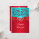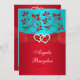 This romantic turquoise blue and red floral wedding invitation has a red PRINTED ribbon and bow with a pair of PRINTED diamond jewels and red FAUX glitter joined hearts buckle on it. It would be perfect for a spring, summer, or fall wedding, and would even work nicely for an elegant destination wedding. ALSO, if you re-size the invitation, or if you change fonts, or the size of the font, some of the design and/or text may get cut-off. Everything will print as you see it on your monitor. I will not see your invitation, and Zazzle will NOT correct anything (typos, mis-alignment etc.). The text and paper is all customizable. If you need help with this invitation, please email me BEFORE you place your order. If you require any other matching items, please email your request to niteowlstudio@gmail.com.