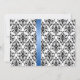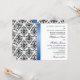 © 2013 Socialite Designs. Our black and white damask wedding invitation has a faux royal blue satin ribbon. All design elements and text are customizable. If you require additional matching wedding products such as save-the-date or thank you photo cards, please do not hesitate to contact Socialite Designs. PLEASE NOTE THAT THE RIBBON IMAGE IS PRINTED ONTO THE INVITATION.