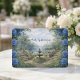 Set the tone for your happily ever after with this fine art stationery suite. Perfect for couples planning a romantic estate or destination garden celebration.This design features a symmetrical, hand-painted illustration style depicting a grand stone staircase leading toward a central water fountain. In the distance, a subtle silhouette of a fairytale castle sits against a soft sky with light clouds. The scene is framed by lush borders of sage green and olive leaves, accented by soft pastel blue roses. The background simulates a muted cream and aged parchment hue, providing a vintage canvas for the elegant cursive script and classic serif typography.