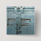 Turquoise grey metal door with locks, wheels, text and some torn tape. Photographed in an old building in Wales, edited. By Alexandra Cook aka Linandara.