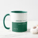 Simple and modern dark green coffee mug personalized with your own special name and profession. A half-green half-white design with sans serif font style.