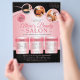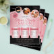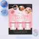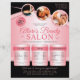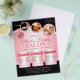 Professional beauty salon price list advertisement flyer features a pink & black background, 3 customizable photos & pink scissor clipart. Customizable to your liking.