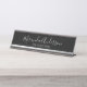 Professional Black and Silver Desk Nameplate featuring name in silver modern script font style and profession in silver modern sans serif font style, with bottom silver border, on black background.