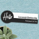 This professional name tag features a name in black on the white background and below on a white background is the title or business name in white. Hello in matching white text is in the circle on the left and can be changed or removed. Personalize the text fields or edit using the design tool to select a font style, size, and color you prefer.