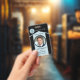 Photo ID badge featuring your custom photo and logo on a black and dusty blue design. On the back you can add a custom bar code or QR code and additional texts (or delete the templates). Great to create an eye-catching presence.