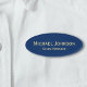 Custom, personalized, ultra-durable, scratch-proof, UV resistant, waterproof, reusable, elegant dark navy blue and faux gold professional business office company corporate cool stylish oval shape acrylic name ID badge tag, with quality magnetic fitting that doesn't leave a tear in clothes. To customize, simply type in your full name and designation / title. While you personalize, you'll be able to see a preview throughout. Makes a great gift for executives, corporate professionals, consultants, self employed professionals, perfect for small and big business, offices, entrepreneurs, and more.