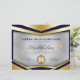 This professional certificate of achievement award features blue and gold, and a grey detailed background. Includes two medal awards: a custom gold and blue medal centred at the bottom with blue stars and a gold medal.