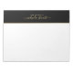 Professional Modern Notepad featuring name in gold modern script font style with custom text in gold modern sans serif font style, on black with gold stripe upper border, on white background.