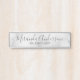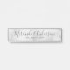 This hanging name plate features name in grey modern script font style and title in grey modern sans serif font style on white marble background.