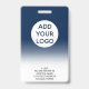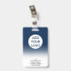 A modern, and professional editable dark blue ombre nurse photo id badge with logo and barcode.