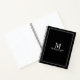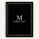 Professional notebook features custom monogram, name and text in white classic serif font style with white border on black background.