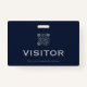 Keep your visitors and guests easily identified with this simple customizable QR visitor badge. The blue and grey design features space to upload your QR code and text that reads "Visitor" in a classic font. The QR code makes it easy for guests to access important information about your facility or event. The text at the bottom reminds visitors to please return the badge before leaving. This badge is perfect for businesses, hospitals, schools, museums, attractions, and more.