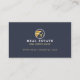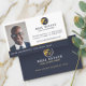 Modern and professional real estate business card design with a photo placeholder incorporated into the design to display your own photo portrait. Clean, minimal layout design with stylish navy and gold real estate house logo that you can personalize with your business name or remove and replace with your own logo. Name and title are displayed prominently along the bottom within a navy blue stripe. Subtle faux gold accents are incorporated into the design to add an elegant professional look. Personalize with your contact information. The reverse side features company logo and additonal contact information, such as website address. You can change the background colour, font, font colour and layout to suit your personal preference. Logo design contained in this design are original artwork by moodthlogy.