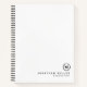 Modern notebook features a minimal design in a classic black and white colour palette. Custom name presented in the lower right hand corner in stylish simple font with a complimentary minimal monogram medallion.
