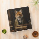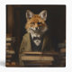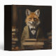 The image depicts an anthropomorphic fox dressed in formal attire, sitting behind a desk surrounded by tall stacks of old books. The fox wears a classic olive-green suit jacket, a crisp white shirt, a patterned waistcoat, and a neatly tied black bow tie. Its expression is calm yet sharp, with intelligent eyes that suggest deep knowledge and curiosity. The setting is dimly lit, with warm, golden light falling softly over the scene, evoking the atmosphere of an old library or study. The worn books add to the sense of history and wisdom, as if the fox is a scholar or professor engrossed in lifelong research.