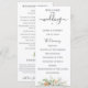 Élégante flore aquarelle botanique blanche, verte et orange pêche, feuillage et fleurs, programme de mariage. Le programme présente une calligraphie mignonne "mariage" avec plusieurs lignes pour des listes de texte personnalisées pour l'ordre des événements de la cérémonie, le cortège de mariage et le mot de remerciement.