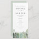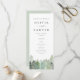 Ces programmes de mariage personnalisables comprennent une forêt enneigée paisible en aquarelle douce, idéale pour les mariages d'hiver ou les cérémonies rustiques. L'avant présente d'élégants verdures et des chutes de neige, tandis que l'aménagement comprend de l'espace pour les détails de la cérémonie, la fête de la mariée et des notes spéciales. Customisez ces programmes de mariage dans les bois avec vos noms, les détails de la cérémonie, ainsi que toute reconnaissance ou citations spéciales.