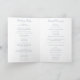 Programme de mariage plié bleu poussiéreux de style classique avec des mots d'accent dans une élégante typographie calligraphique. Le front a vos détails de l'événement, l'intérieur a votre fête de mariage et l'ordre de cérémonie. Le dos a un modèle pour votre message / devis. Ces programmes de mariage sont parfaits pour un mariage officiel.