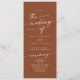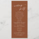 Ce programme de mariage chic en terre cuite boho est parfait pour une cérémonie mariage minimaliste. Le design moderne et bohème orangé terreux présente une calligraphie rustique simple, avec un style unique mais classique. Personnalisez votre programme de mariage avec vos noms, la date du mariage, l'emplacement, l'ordre de service, la fête de mariage et optionnel en mémoire d'amour.
