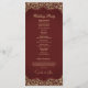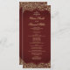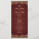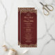 Ce programme de mariage exhale l'élégance avec son fond bordeaux profond et ses accents damassés dorés complexes. Le côté avant présente les détails complets du programme de mariage sur un panneau bordeaux riche bordé de fleurs dorées ornées, créant une impression royale et intemporelle. Au contraire, les noms du couple sont magnifiquement mis en valeur dans un cadre en damas doré circulaire. La combinaison de bordeaux et d'or offre un style luxueux et formel, parfait pour les grandes fêtes mariages.