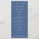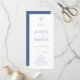 CAPE COD Coastal Blue, programme de mariage. Caractéristiques, typographie bleu clair et coquillage de coquillages à coquilles Saint-Jacques illustration sur le devant avec typographie blanche et support arrière - plan bleu marine poussiéreux.