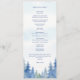 Ce programme de mariage présente une aquarelle bleue tranquille avec une silhouette de forêt brumeuse le long de la bordure inférieure. L'arrière - plan en dégradé doux passe du bleu doux au sommet à un centre blanc propre, créant un effet paisible et élégant. La disposition est moderne et épurée, en utilisant une police serif classique en bleu pour tout le texte. Le devant affiche les noms du couple et un ordre clair de cérémonie. Le verso liste la fête de mariage, y compris le célébrant, les parents, la bonne d'honneur, le meilleur homme, les demoiselles d'honneur, les groomsmen, la fille de fleurs, et le porteur de bague. Un message de remerciement sincère du couple est inclus en bas. Cette carte double face est idéale pour les mariages de bois, d'hiver ou de plein air, offrant un look sophistiqué et apaisant.