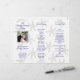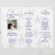 Programme de mariage photo à plier en trois. Pliage accordéon avec fond à motif d'étoile de mer et texte bleu indigo. Personnalisez en trois sections avec photo du couple sur le panneau avant. Le verso de ce papier n'aura pas de motif et sera blanc uni.