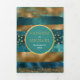 Programme de mariage triptyque avec des traits de pinceau bleu sarcelle et or et des confettis. Ce beau design présente des traits de pinceau sarcelle et or ainsi que des confettis. Votre texte est dans un cadre sarcelle avec une bordure dorée. Il est parfait pour un mariage d'automne ou d'hiver.