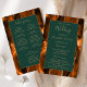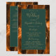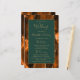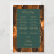 Ce programme de mariage élégant et moderne présente un fond d'agate orange brûlé et rouille rehaussé de fausse brillance dorée. Le texte apparaît dans une écriture manuscrite dorée élégante et des polices copperplate sur un rectangle vert foncé.