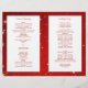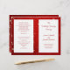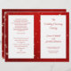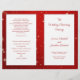 Noël, fête, programme de mariage modèle avec des modèles texte pour une cérémonie d'église catholique. Le rouge scintillant est arrière - plan avec des panneaux blancs qui tiennent les modèles de texte rouge. Cela crée une apparence en couches sur les deux côtés du papier. La police manuscrite moderne est utilisée pour le titre, les noms et le message au verso, le reste du texte étant imprimé. La dernière page (au dos du programme lorsqu'elle est pliée) comprend une section pour les écritures (exemple : "L'amour est patient, l'amour est gentil" de 1 Corinthiens) et un message de la mariée et du marié.