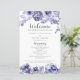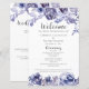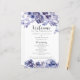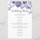 Un élégant programme de mariage hivernal floral encadré par des roses violettes aquarelles chic. Le programme personnalisé présente une belle bordure de fleurs violettes et de feuilles botaniques lavande en haut et en bas autour des détails de votre cérémonie et du cortège.