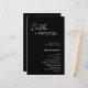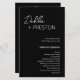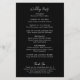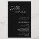 Programme de mariage noir moderne avec un design simple et minimal avec le nom de la mariée dans un script élégant et le nom du marié dans une police sans serif contemporaine. Vous trouverez ci-dessous, dans le coin inférieur droit, les détails de votre événement et l'ordre de la cérémonie dans un agencement minimaliste. Le dos a votre fête de mariage et message de remerciement.