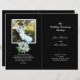 Programme de mariage photo noir et blanc. Un petit bouquet de fleurs blanches d'hydrangée orne l'intérieur et l'arrière-page sous le modèle photo. Personnalisez les 4 sections avec le texte de la cérémonie, le message de remerciement ou tout ce que vous choisissez.