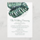 Un énorme feuille tropicale de monstera sur un modèle de programme de mariage chic parfait pour un mariage moderne de destination, un mariage sur la plage ou un mariage sur une île tropicale verte.