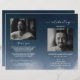 Programme funéraire mettant en vedette sur le devant une photo du défunt, son nom, ses dates, le lieu du mémorial, la date de l'événement, et cadre élégant. A l'intérieur se trouve une nécrologie et un ordre de service ; et au dos une autre photo, une note de remerciement et le deuxième lieu pour après les funérailles. REMARQUE : Ceux-ci viennent comme un morceau plat de papier de qualité, vous aurez besoin de les plier vous-même.