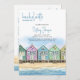Invitation à un week-end de célibataire sur la plage avec itinéraire. Conception à l'aquarelle présentant une rangée de cabines de plage en bois colorées et peintes sur le sable doré en bord de mer, profitant de vues sur la mer de première ligne et d'un ciel bleu estival. Le modèle est configuré pour que vous puissiez ajouter les détails du week-end et de l'organisateur avec votre itinéraire de week-end au verso. Si vous devez apporter des modifications aux en-têtes ou à l'espacement, par exemple, cliquez sur "modifier à l'aide de l'outil de conception".