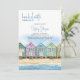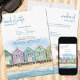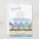 Invitation à un week-end Beach Bachelorette avec itinéraire. Conception à l'aquarelle représentant une rangée de cabines de plage colorées et peintes sur le sable doré en bord de mer, profitant de vues sur la mer de première ligne et d'un ciel bleu estival. Le modèle est configuré pour que vous puissiez ajouter les détails du week-end et de l'organisateur avec votre itinéraire de week-end au verso. Si vous devez apporter des modifications aux en-têtes ou à l'espacement, par exemple, cliquez sur "modifier à l'aide de l'outil de conception".