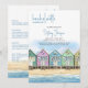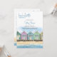 Invitation pour un week-end de célibataire à la plage avec itinéraire. Conception à l'aquarelle représentant une rangée de cabines de plage en bois colorées et peintes sur le sable doré en bord de mer, profitant de vues sur la mer de première ligne et d'un ciel bleu estival. Le modèle est configuré pour que vous puissiez ajouter les détails du week-end et de l'organisateur avec votre itinéraire de week-end au verso. Si vous devez apporter des ajustements aux en-têtes ou à l'espacement, par exemple, cliquez sur "modifier à l'aide de l'outil de conception".