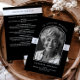 Cette élégante conception de programme commémoratif présente une palette de couleurs noir et blanc intemporelle, créant un ton sophistiqué et respectueux idéal pour une célébration de la vie ou des funérailles. L'avant présente une disposition moderne et minimaliste avec une typographie serif raffinée et des accents structurés encadrant la photo personnalisée en forme d'arc et les détails clés, en mettant l'accent sur la clarté et la grâce. Le dos poursuit l'élégante simplicité avec une section d'ordre de service structurée, présentée en noir classique contre un arrière - plan blanc immaculé pour une lisibilité facile. Parfait pour les mémoriaux, les services funéraires et les cérémonies de la vie, ce design offre un hommage professionnel, poli et sincère qui honore les êtres chers avec dignité et style tout en offrant une expérience homogène et personnalisable pour les familles.