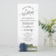 Ce magnifique programme de mariage présente un design élégant avec un seul rose à long tige en acier poussiéreux bleu ou bleu gris allongé sur son côté réfléchissant dans l'eau. Les titres sont écrits en calligraphie de script sophistiquée, et il y a de l'espace pour vos détails de cérémonie et de mariage, ainsi qu'un bref merci pour vos invités. Merveilleuse façon d'accueillir vos amis et votre famille à votre fête mariage.