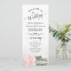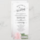Ce magnifique programme de mariage présente un design élégant avec un seul rose à long tige rose pâle pâle pâle, allongé sur son côté réfléchissant dans l'eau. Les titres sont écrits en calligraphie de script sophistiquée, et il y a de l'espace pour vos détails de cérémonie et de mariage, ainsi qu'un bref merci pour vos invités. Merveilleuse façon d'accueillir vos amis et votre famille à votre fête mariage.